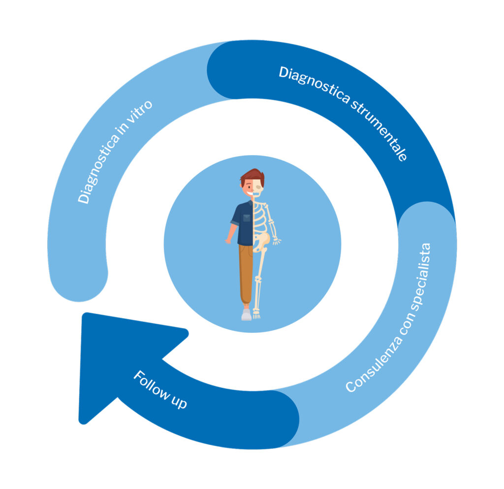 Acido Urico, Calcio Totale, Calcio Urinario, Calcitonina, Creatinina, Elettroforesi Proteine Sieriche, Emocromo Completo, Esame Urine, Fosfatasi Alcalina Ossea Specifica, Fosfato Inorganico Sierico, Fosfato Inorganico Urinario, Glicemia, Magnesio, Paratormone, Transaminasi GOT, Transaminasi GPT, TSH Reflex, VES, Vitamina D, CTX Siero.